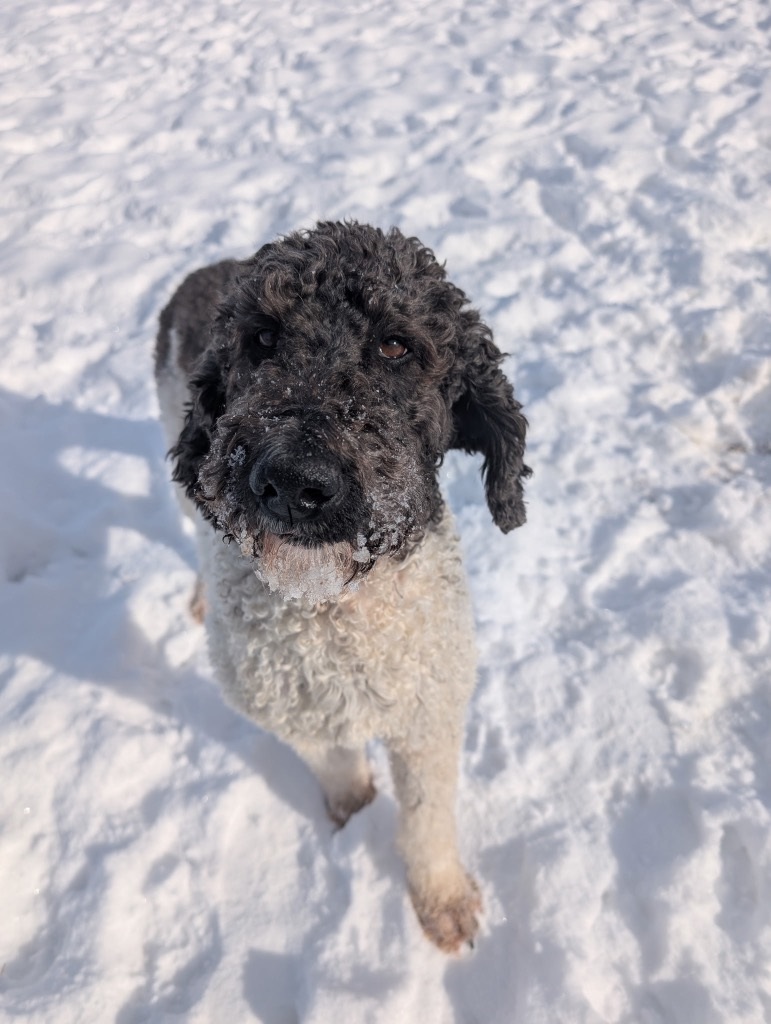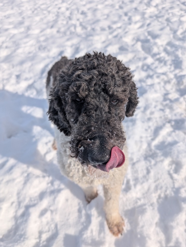 Monica walks great on leash and is so well-mannered. She is happy to settle at your feet when you’re relaxing, rides great in the car, and keeps a super clean kennel. She is used to regular grooming, which is necessary to maintain those gorgeous curls.