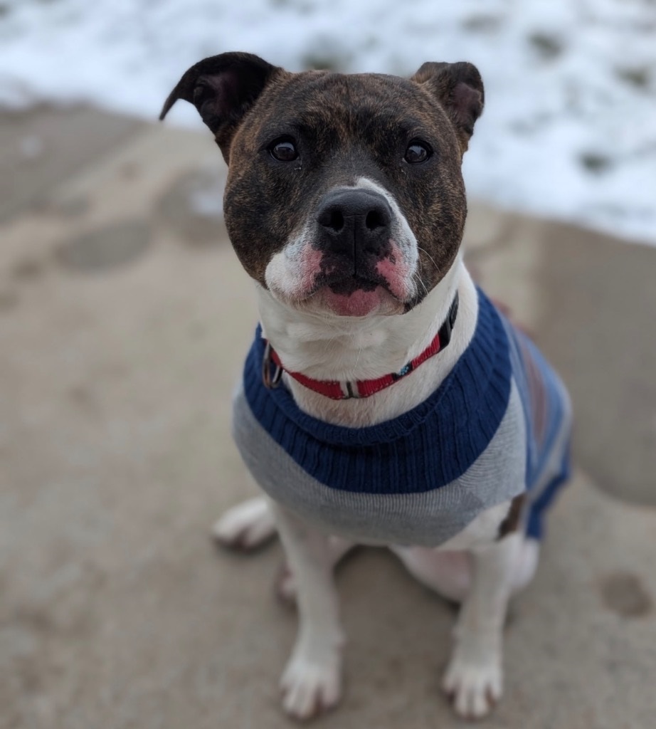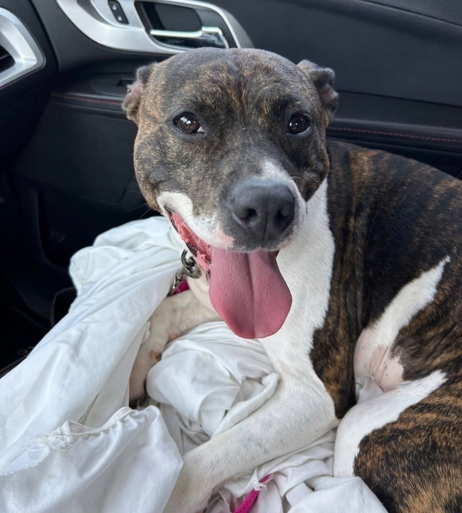 Nadine is a walking party. She is energetic, bouncy, and always ready for fun. An active home or a big yard to zoom around in would be her dream come true. Just be prepared, she can come on a little strong when meeting new people and pets, so slow introductions are the way to go with this silly girl.