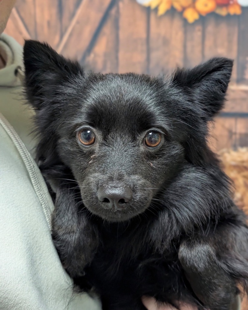 He is the biggest little fluffball in his crew and basically a pocket-sized black bear. This fuzzy guy is pure sweetness, and we know his future family will swoop him up soon!