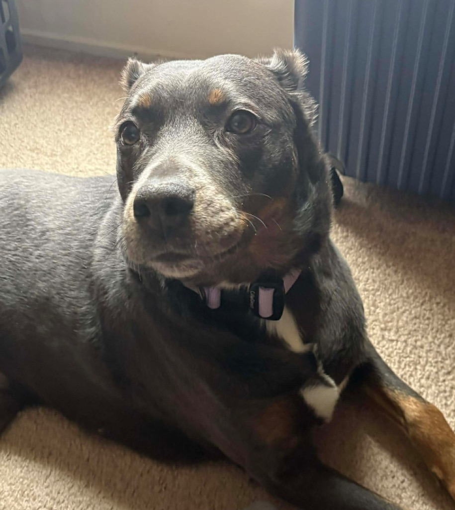 She seems comfortable around calm, low key dogs, but she has not been tested with cats. Because she can have the occasional sour mood, we do not recommend a home with small kids. And with her lack of coordination, a home with lots of stairs likely would not be ideal.